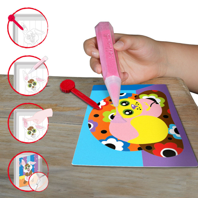 La stampa con laseratura viene fatta a diversi livelli di incisione per facilitare il distacco dei singoli elementi dai fogli adesivi e la rimozione della pellicola prima di colorare con la sabbia.
