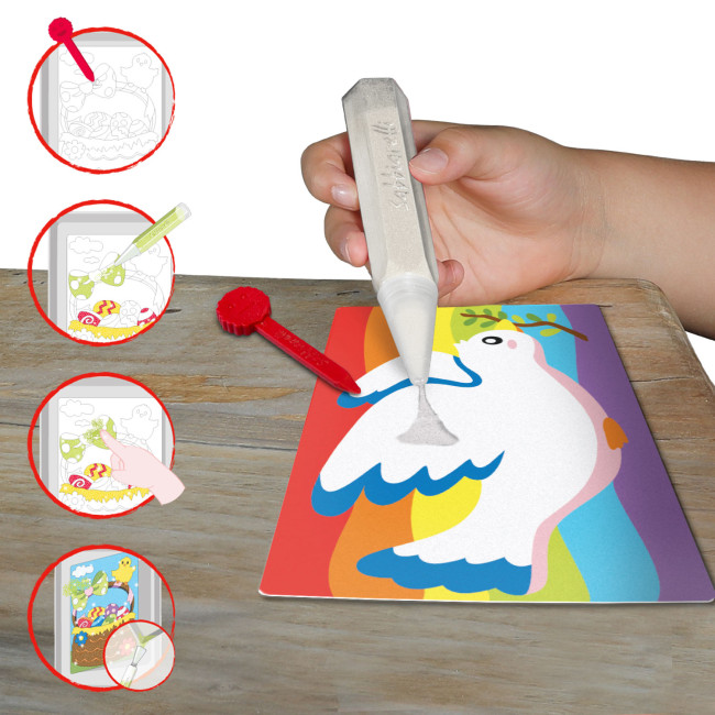 La stampa con laseratura viene fatta a diversi livelli di incisione per facilitare il distacco dei singoli elementi dai fogli adesivi e la rimozione della pellicola prima di colorare con la sabbia.