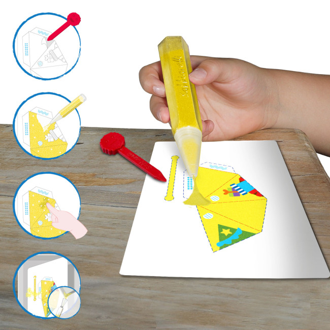 La stampa con laseratura viene fatta a diversi livelli di incisione per facilitare il distacco dei singoli elementi dai fogli adesivi e la rimozione della pellicola prima di colorare con la sabbia.