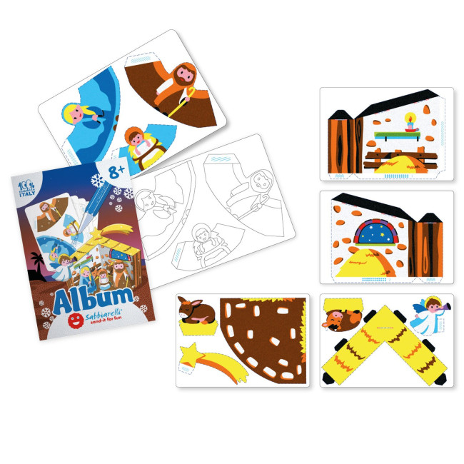 Ogni album contiene 5 disegni (15x20cm) pretagliati su carta adesiva contenenti addobbi natalizi da sabbiarellare e staccare.