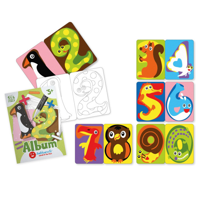Ogni album contiene disegni pretagliati su carta adesiva raffiguranti lettere e numeri a forma di animali e oggetti, pronti per essere colorati con la sabbia.