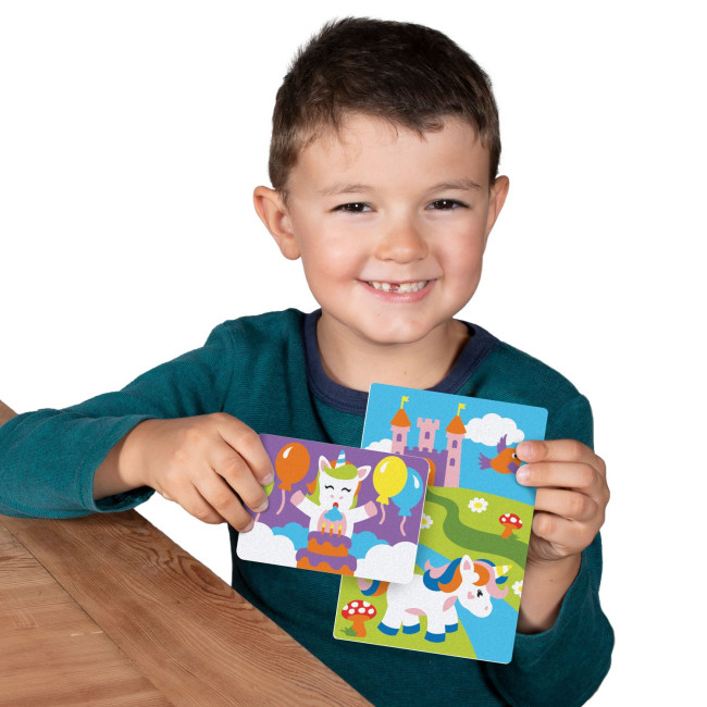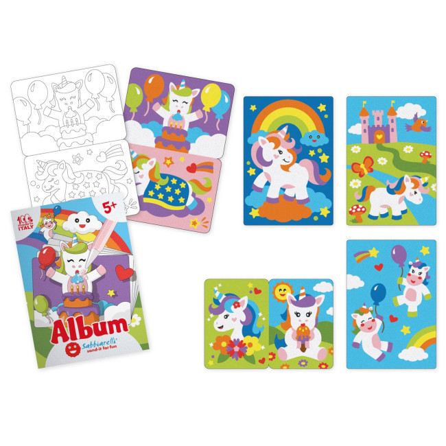 Ogni album contiene 5 fogli (15x20cm) pretagliati su carta adesiva raffiguranti diversi personaggi fantastici, pronti per essere colorati con la sabbia.