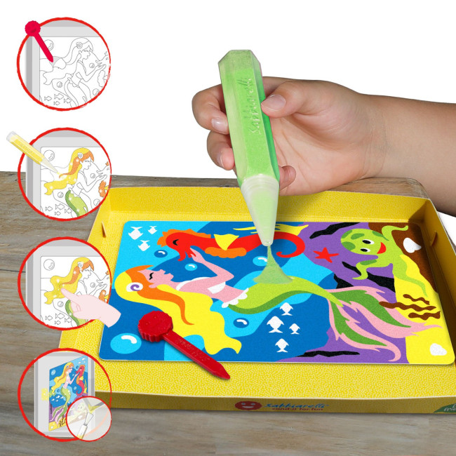 Grazie alle speciali penne Sabbiarelli, colorare con la sabbia è un'azione alla portata di tutti: i piccoli artisti possono liberare la loro creatività nella colorazione, seguendo l'esempio colore o scegliendo nuove combinazioni o ancora creando nuove sfumatore di colore mischiando tra loro le sabbie, senza sprechi.