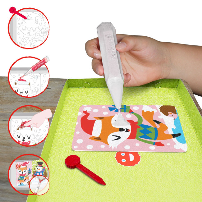 Ogni album contiene 5 disegni (15x20cm) pretagliati su carta adesiva contenenti disegni e cartoline natalizie da sabbiarellare.