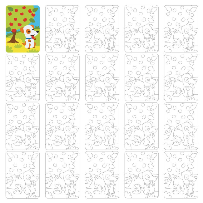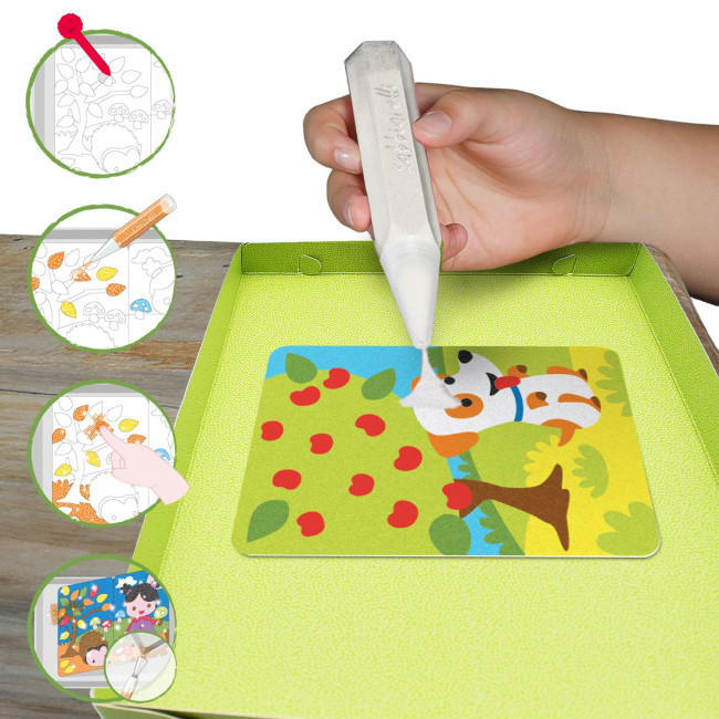 Il multipack contiene 10 fogli (15x20cm) pretagliati su carta adesiva con 20 disegni che raffigurano la stagione dell'Estate, pronti per essere colorati con la sabbia. Non servono né forbici, né colla: rimuovendo la carta dal disegno rimane la superficie adesiva da colorare con le sabbie Sabbiarelli® (sabbia non inclusa)