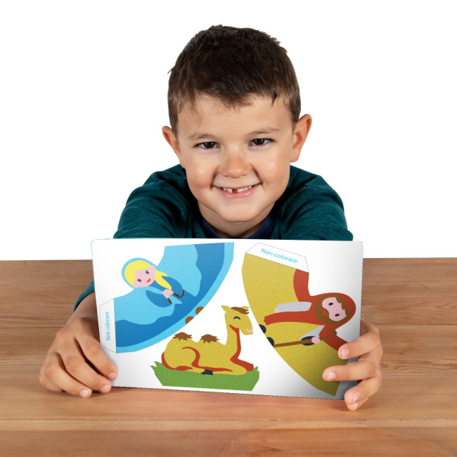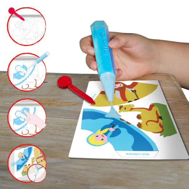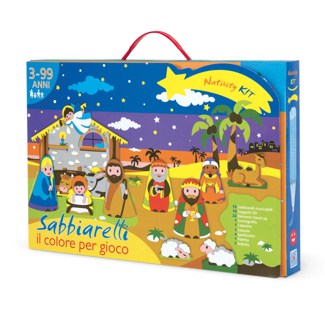 Il Nativity Kit è un kit che consente di costruire un vero Presepio, dalla realizzazione delle statuine e degli elementi decorativi fino al loro posizionamento in uno spazio delimitato dalla scenografia a tema, inclusa nella confezione e che misura 70x25x25 cm. La ricchezza degli elementi e dei dettagli che compongono il Nativity Kit lo rendono un gioco davvero stimolante. Non servono forbici o colla: rimuovendo la carta dai fogli rimane la superficie adesiva da colorare con le sabbie Sabbiarelli®. Grazie alle speciali penne Sabbiarelli, colorare con la sabbia è un'azione alla portata di tutti: i piccoli artisti possono liberare la loro creatività nella colorazione, seguendo l'esempio colore o scegliendo nuove combinazioni o ancora creando nuove sfumatore di colore mischiando tra loro le sabbie. La sabbia può essere di volta in volta rimessa nella penna dello stesso colore, oppure mischiando le sabbie si possono creare nuove nuances da utilizzare per colorare in modo ancor più creativo i disegni.