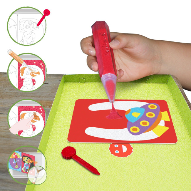 Grazie alle speciali penne Sabbiarelli, colorare con la sabbia è un'azione alla portata di tutti: i piccoli artisti possono liberare la loro creatività nella colorazione, seguendo l'esempio colore o scegliendo nuove combinazioni o ancora creando nuove sfumatore di colore mischiando tra loro le sabbie, senza sprechi.