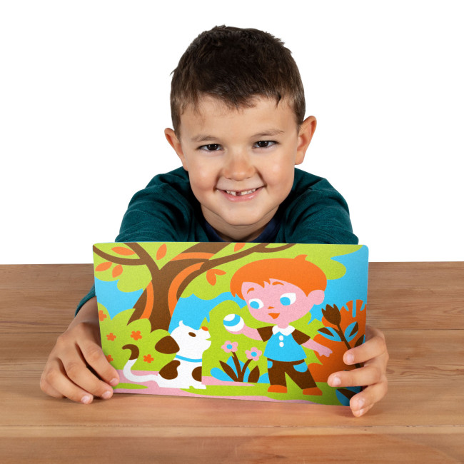 Un Kit per divertirsi colorando con la sabbia i disegni che raccontano i momenti di gioco tra bambini e cuccioli. Il kit contiene 6 penne di sabbia ricaricabili, 1 spellicolino, 1 vassio e 4 disegni pretagliati (10x15cm) su carta adesiva con disegni di bambini e cuccioli.