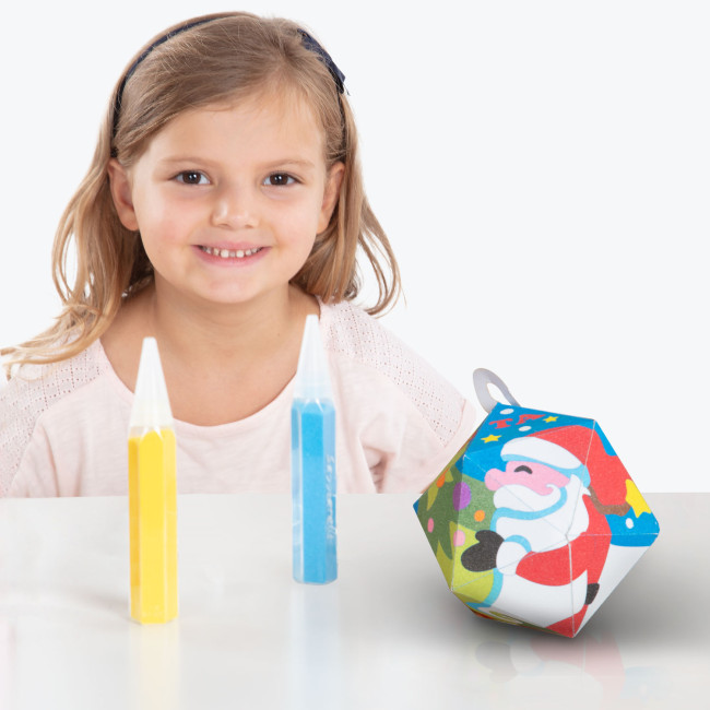 A Christmas tree ornament to be coloured with Sabbiarelli, assembled, and used to decorate the tree. There is no need for scissors or glue: the ornament with a diameter of 12 cm is made by assembling the 5 sheets provided in the package in a simple and fast way, following the instructions shown on the information leaflet. The Christmas themes of this album are: Santa Claus and the Snowman. The ring for hanging the ornament from the tree is included in the package. An object that adds a great sparkle to the Christmas decorations of your home and that can become an original gift to be combined with the Sabbiarelli pens basket