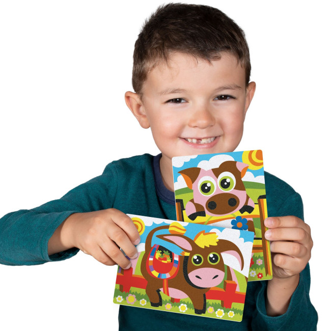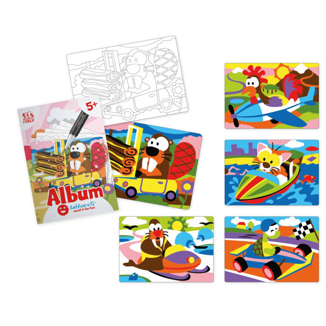 Ogni album contiene 5 disegni (15x20cm) pretagliati su carta adesiva, pronti per essere colorati con la sabbia.
