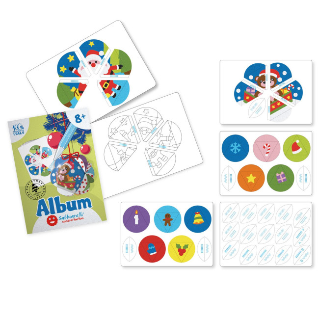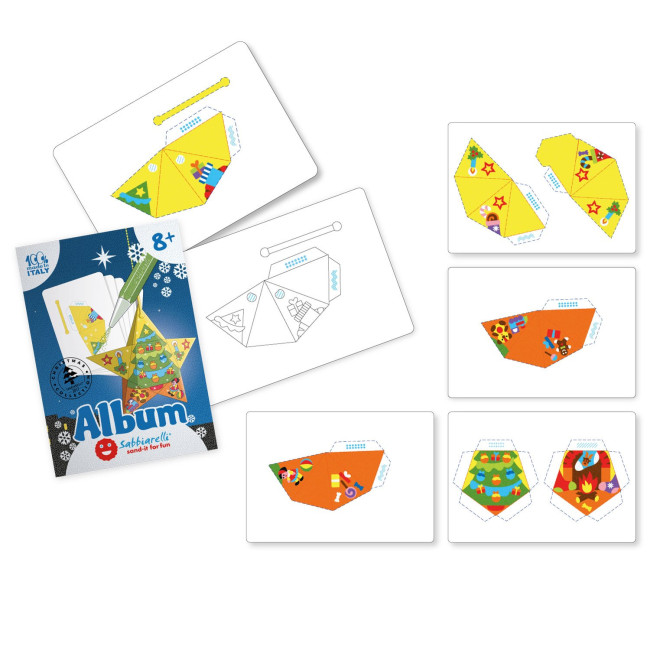 Ogni album contiene 5 fogli (15x20cm) pretagliati su carta adesiva da sabbiarellare e da assemblare per creare delle palle di Natale 3D.