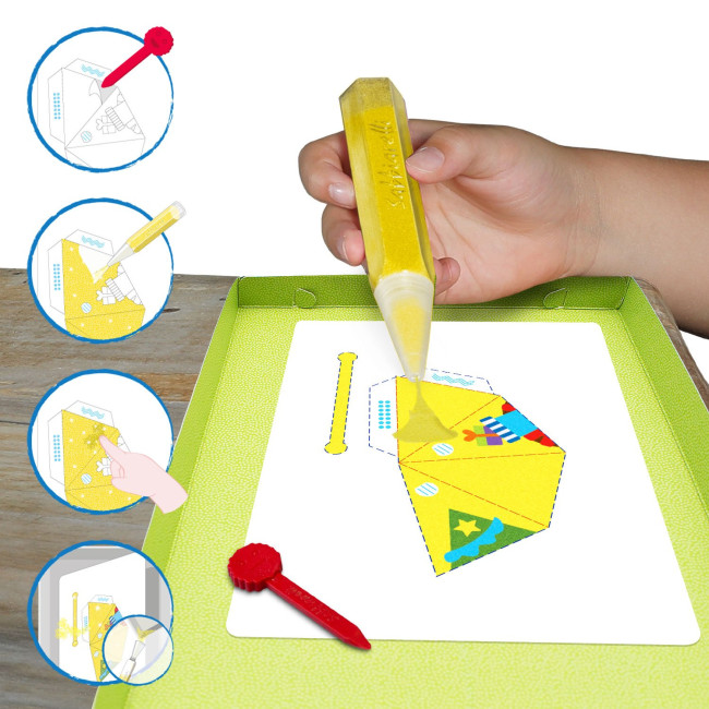 Grazie alle speciali penne Sabbiarelli, colorare con la sabbia è un'azione alla portata di tutti: i piccoli artisti possono liberare la loro creatività nella colorazione, seguendo l'esempio colore o scegliendo nuove combinazioni o ancora creando nuove sfumatore di colore mischiando tra loro le sabbie, senza sprechi.