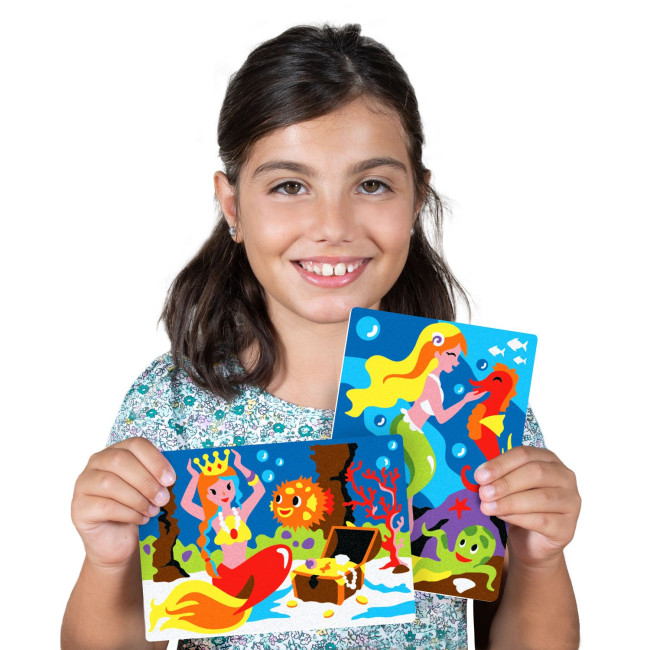 Ogni album contiene 5 fogli (15x20cm) pretagliati su carta adesiva raffiguranti diversi personaggi fantastici, pronti per essere colorati con la sabbia.