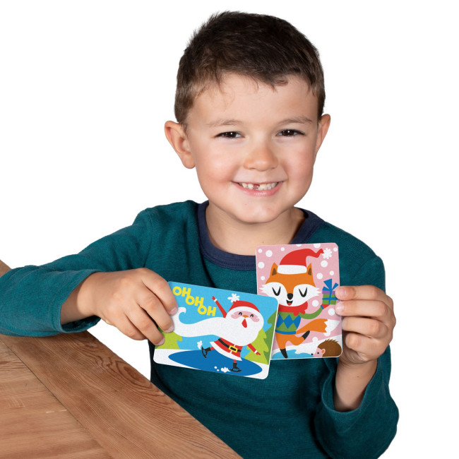• Le cartoline di Natale: Il Babbo Natale sul ghiaccio - L'alce addobbata - Il gufo con la sciarpa - L'orso coi pomelli, Il pinguino e l'uccellino con l'abete - Le palline e le decorazioni - La foto natalizia di famiglia - Il pupazzo, l'uccellino e tanti doni - La volpe col regalo - Saluti dal pupazzo di neve.