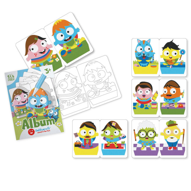 Ogni album contiene fogli (15x20cm) pretagliati su carta adesiva ognuno con una cartolina, un addobbo da staccare, o con un disegno dedicato alla Pasqua, pronti per essere colorati con la sabbia.