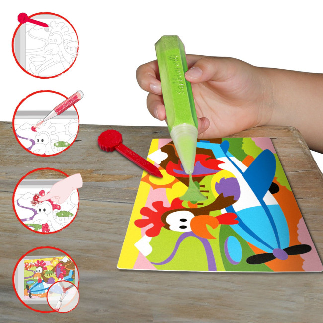 Grazie alle speciali penne Sabbiarelli, colorare con la sabbia è un'azione alla portata di tutti: i piccoli artisti possono liberare la loro creatività nella colorazione, seguendo l'esempio colore o scegliendo nuove combinazioni o ancora creando nuove sfumatore di colore mischiando tra loro le sabbie, senza sprechi.