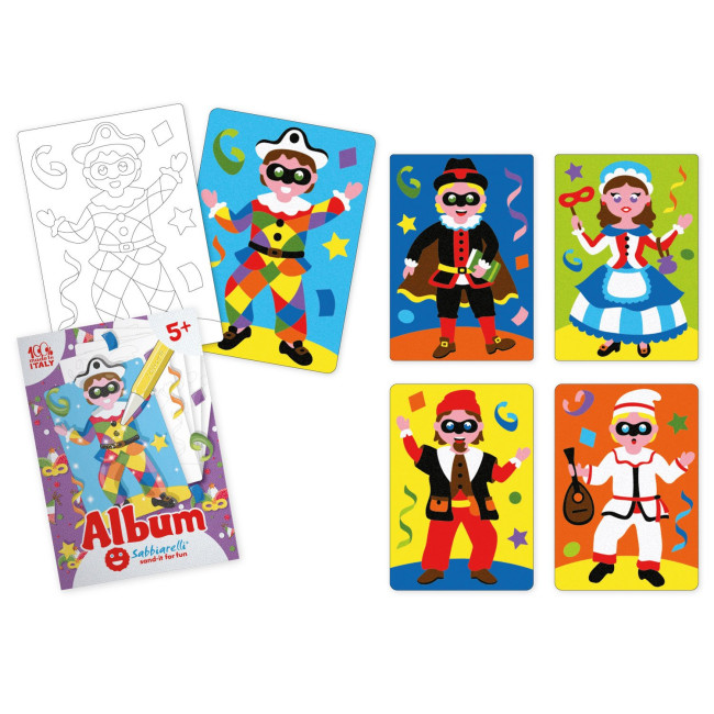 Ogni album contiene fogli (15x20cm) pretagliati su carta adesiva ognuno con una diversa mascherina da staccare, o con il disegno di una maschera di Carnevale, pronti per essere colorati con la sabbia.
