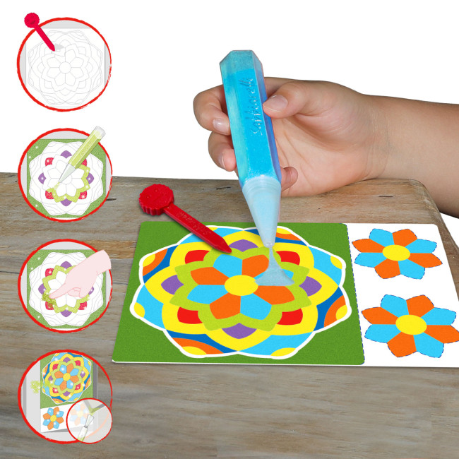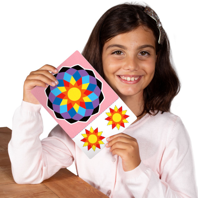 Ogni mandala contiene un messaggio. Il Manda Sole è stato realizzato per ricordare che abbiamo sempre la possibilità di splendere e lo facciamo nel momento in cui riusciamo a manifestare ciò che siamo nel modo e sentiamo più affine a noi. Ha un basso grado di difficoltà proprio per avvicinare alla colorazione con la sabbia. I dettagli sono di media grandezza. Partire dal centro e colorarlo verso l’esterno aiuta a ritrovare l’energia per manifestare ciò che siamo senza timore. I colori suggeriti sono caldi al centro, come il sole, e vanno via via scurendosi fino a diventare cupi come la notte, momento del riposo e della riflessione. Il Mandala Fiore è stato realizzato per evidenziare i chiaro scuri che caratterizzano l’individuo. Abbiamo la possibilità di sperimentare e vivere gli alti e bassi e di mantenere il nostro equilibrio come un fiore con le sue diverse sfumature. I colori suggeriti tra quelli disponibili mettono in risalto proprio la capacità di trovare l’armonia. Anche in questo caso la difficoltà è bassa perché i pezzi sono di media grandezza. Il Mandala Rosone è realizzato ispirandosi ai rosoni tipici delle chiese. Ha sei sezioni che creano una stella e il numero suggerisce equilibrio, armonia e invoglia alla ricerca del bello e dell’estetica. Il cerchio rosso centrale richiama proprio al radicamento ossia alla capacità di stare nel presente, nel famoso qui e ora, e di focalizzarsi solo su ciò che si sta facendo senza distrazioni, pensieri o ansie. In questo mandala troviamo pezzi di varie dimensioni che lo collocano a una difficoltà media. Il Mandala Bottoni ha un fiore centrale a otto petali e gioca sul contrasto di colori complementari con l’obiettivo di mostrare che l’armonia è possibile anche là dove tutto sembra diverso e inconciliabile. Si rifà all’otto della numerologia, concreto, materiale, fisico. La forma è data dall’accostamento di parti con grandezze diverse e si chiude con un giro di bottoni, le parti più piccole, che lo rendono di difficoltà medio-alta.