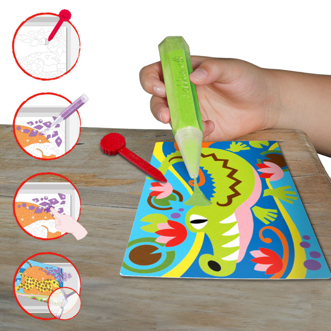La stampa con laseratura viene fatta a diversi livelli di incisione per facilitare il distacco dei singoli elementi dai fogli adesivi e la rimozione della pellicola prima di colorare con la sabbia.