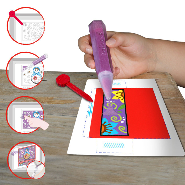La stampa con laseratura viene fatta a diversi livelli di incisione per facilitare il distacco dei singoli elementi dai fogli adesivi e la rimozione della pellicola prima di colorare con la sabbia.