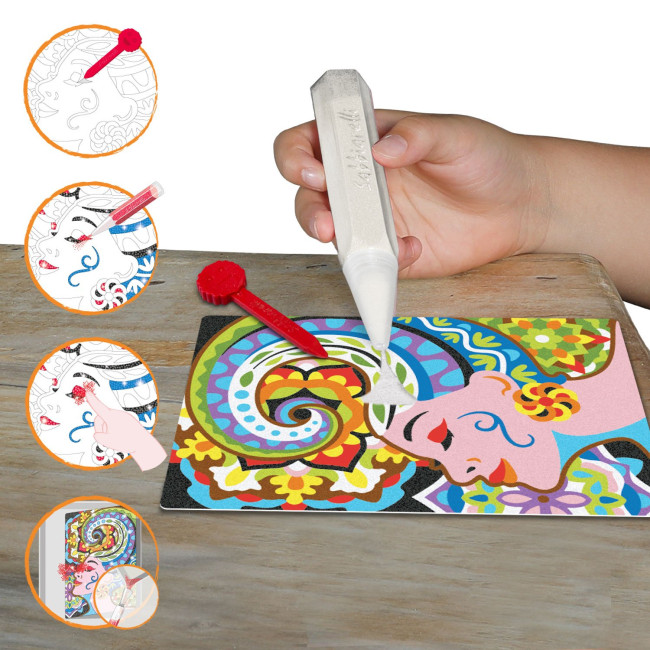 Colorare con la sabbia è un’attività dalla quale anche gli adulti possono trarre grandi benefici per la salute fisica e mentale. Attraverso il sandpainting con i Sabbiarelli si allena la motricità manuale, perché si richiede di rimuovere la pellicola dai disegni usando lo spellicolino e di maneggiare le penne per dosare la sabbia quando si colora. Ma la stimolazione sensoriale è legata anche al tipo di pittura che caratterizza il sandpainting, cioè la pittura materica, fatta direttamente con le dita. La sensazione che si prova colorando con le dita, premendo i granelli di sabbia finissima per farli aderire bene agli inserti adesivi del disegno, è piacevole ed appagante. La speciale sabbia di marmo dei Sabbiarelli è morbida al tatto, e questa sua peculiarità la rende particolarmente adatta proprio per essere massaggiata con la mano, senza l’uso di pennelli. Vi sono poi altri aspetti positivi legati a questa speciale tecnica di colorazione. La sequenzialità delle operazioni richieste per colorare con la sabbia aiuta a recuperare la calma e a ridurre lo stress. La necessità di prestare di attenzione e concentrazione permette di interrompere il flusso di pensieri e di entrare in uno stato di benefico rilassamento. Infine, il sandpainting con i Sabbiarelli migliora l’autostima, perché implica un obiettivo e il suo raggiungimento è gratificante. I disegni colorati con la sabbia di marmo dei Sabbiarelli sono veri e propri quadri, perfetti grazie alla laseratura che incide i fogli in modo da poter colorare ogni singola parte del disegno senza sconfinare in quelle adiacenti e alla speciale sabbia luccicante dei Sabbiarelli, che proviene dal marmo bianco di Carrara ed è naturalmente scintillante. Con i Sabbiarelli il mondo della creatività e quello della meditazione trovano un punto di incontro ideale, sia per coltivare la propria vena artistica, che per staccarsi, anche solo per qualche ora, dai problemi della quotidianità.