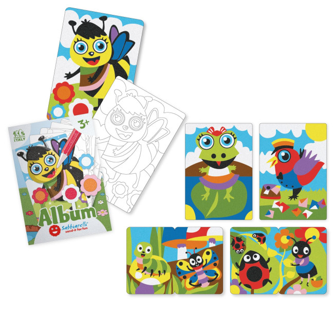 Ogni album contiene 5 disegni (15x20cm) pretagliati su carta adesiva raffiguranti diversi animali, pronti per essere colorati con la sabbia.