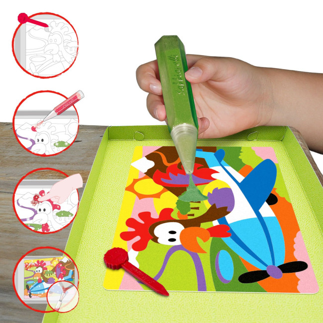 Grazie alle speciali penne Sabbiarelli, colorare con la sabbia è un'azione alla portata di tutti: i piccoli artisti possono liberare la loro creatività nella colorazione, seguendo l'esempio colore o scegliendo nuove combinazioni o ancora creando nuove sfumatore di colore mischiando tra loro le sabbie, senza sprechi.