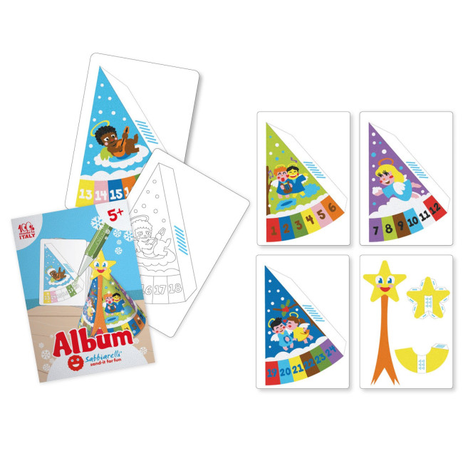 Ogni album contiene 5 disegni (15x20cm) pretagliati su carta adesiva contenenti addobbi natalizi da sabbiarellare e staccare.