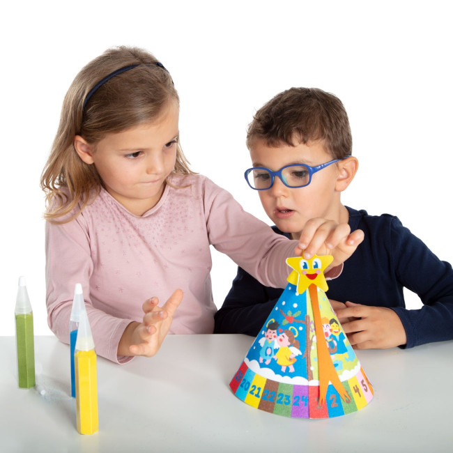 Non servono né forbici, né colla: rimuovendo la carta dal disegno rimane la superficie adesiva da colorare con le 12 penne di sabbia Sabbiarelli incluse nel basket.