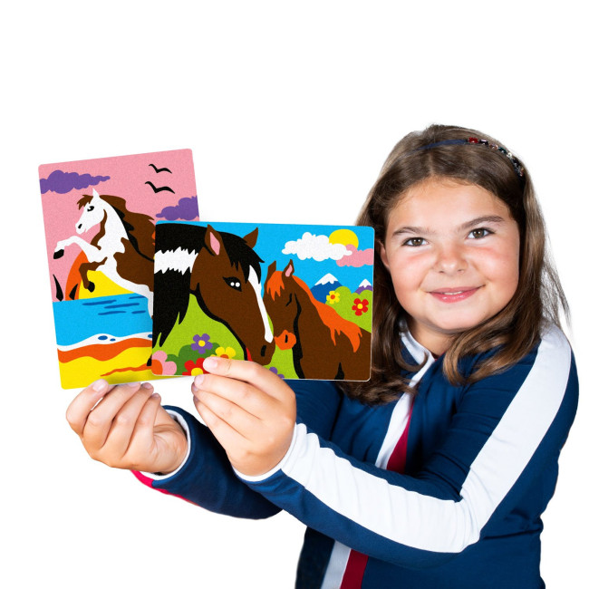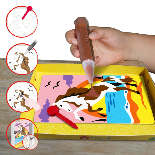 Grazie alle speciali penne Sabbiarelli, colorare con la sabbia è un'azione alla portata di tutti: i piccoli artisti possono liberare la loro creatività nella colorazione, seguendo l'esempio colore o scegliendo nuove combinazioni o ancora creando nuove sfumatore di colore mischiando tra loro le sabbie, senza sprechi.