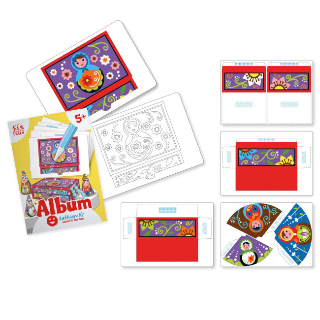 Ogni album contiene 5 disegni (15x20cm) pretagliati su carta adesiva, pronti per essere colorati con la sabbia.