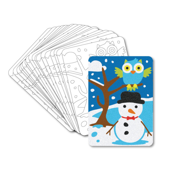 Il multipack contiene 10 fogli (15x20cm) pretagliati su carta adesiva con 20 disegni che raffigurano la stagione dell'Inverno, pronti per essere colorati con la sabbia. Non servono né forbici, né colla: rimuovendo la carta dal disegno rimane la superficie adesiva da colorare con le sabbie Sabbiarelli® (sabbia non inclusa)