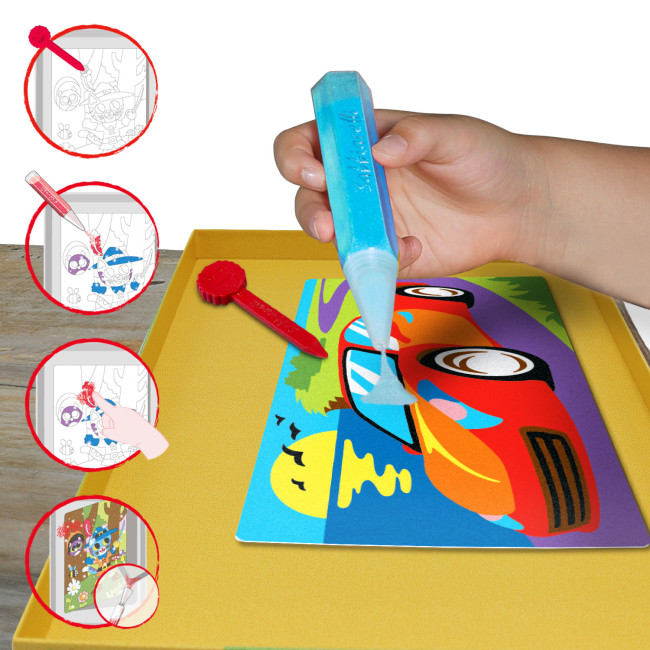Per colorare con la sabbia tutti i disegni contenuti nel kit non servono forbici o colla: rimuovendo la carta dai fogli rimane la superficie adesiva da colorare con le sabbie Sabbiarelli®. Grazie alle speciali penne Sabbiarelli®, colorare con la sabbia è un'azione alla portata di tutti: i piccoli artisti possono sprigionare la loro creatività nella colorazione in modi diversi, seguendo l'esempio colore, scegliendo nuove combinazioni di colori o creando nuove tinte mischiando tra loro le sabbie. Le penne porta-sabbia facilitano anche il dosaggio della sabbia durante la fase di colorazione, evitando inutili sprechi. Inoltre la sabbia in eccesso che non resta incollata sui disegni rimane nel vassoio e può essere recuperata e versata nuovamente nelle penne.