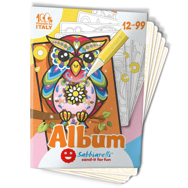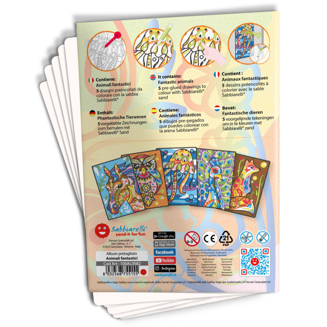 L'album contiene 5 fogli (15x20cm) con 5 disegni pretagliati su carta adesiva raffiguranti Animali fantastici rappresentati con la tecnica dei doodle, ovvero delle trame intrecciate tra loro, pronti per essere colorati con la sabbia. Non servono né forbici, né colla: rimuovendo la carta dal disegno rimane la superficie adesiva da colorare con le sabbie Sabbiarelli® (sabbia non inclusa) I soggetti rappresentati sono: Il cavallo - La medusa - Il gufo - Il pavone - La volpe. Una volta colorati con la sabbia, i disegni possono essere usati come biglietti per accompagnare un messaggio o quadretti da appendere, senza ulteriori trattamenti. La sabbia infatti rimane perfettamente incollata ai disegni. All'interno dell'album sono presenti le istruzioni con gli esempi colore, ma ognuno é libero di colorare scegliendo le tinte che preferisce, dando spazio al proprio estro creativo. Per la complessità dei disegni e il numero di dettagli piccoli che caratterizza questi soggetti, si consiglia a un pubblico con una buona manualità fine.