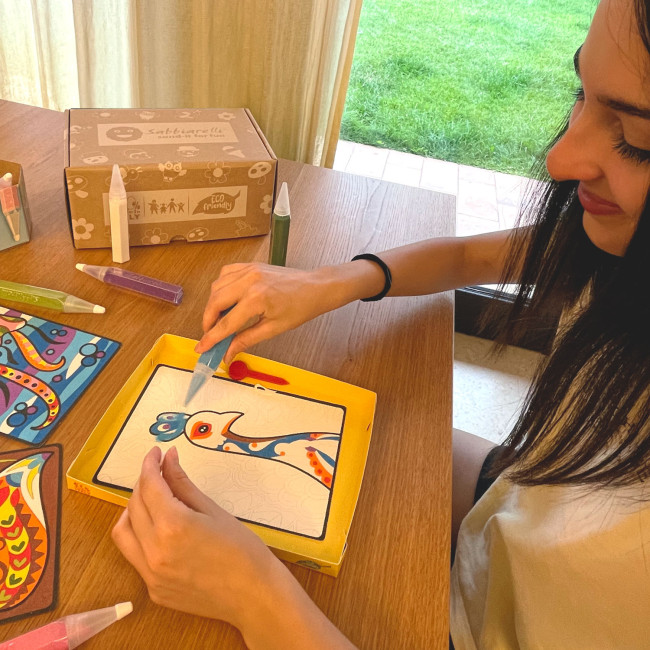 Colorare con la sabbia è un’attività dalla quale anche gli adulti possono trarre grandi benefici per la salute fisica e mentale. Attraverso il sandpainting con i Sabbiarelli si allena la motricità manuale, perché si richiede di rimuovere la pellicola dai disegni usando lo spellicolino e di maneggiare le penne per dosare la sabbia quando si colora. Ma la stimolazione sensoriale è legata anche al tipo di pittura che caratterizza il sandpainting, cioè la pittura materica, fatta direttamente con le dita. La sensazione che si prova colorando con le dita, premendo i granelli di sabbia finissima per farli aderire bene agli inserti adesivi del disegno, è piacevole ed appagante. La speciale sabbia di marmo dei Sabbiarelli è morbida al tatto, e questa sua peculiarità la rende particolarmente adatta proprio per essere massaggiata con la mano, senza l’uso di pennelli. Vi sono poi altri aspetti positivi legati a questa speciale tecnica di colorazione. La sequenzialità delle operazioni richieste per colorare con la sabbia aiuta a recuperare la calma e a ridurre lo stress. La necessità di prestare di attenzione e concentrazione permette di interrompere il flusso di pensieri e di entrare in uno stato di benefico rilassamento. Infine, il sandpainting con i Sabbiarelli migliora l’autostima, perché implica un obiettivo e il suo raggiungimento è gratificante. I disegni colorati con la sabbia di marmo dei Sabbiarelli sono veri e propri quadri, perfetti grazie alla laseratura che incide i fogli in modo da poter colorare ogni singola parte del disegno senza sconfinare in quelle adiacenti e alla speciale sabbia luccicante dei Sabbiarelli, che proviene dal marmo bianco di Carrara ed è naturalmente scintillante. Con i Sabbiarelli il mondo della creatività e quello della meditazione trovano un punto di incontro ideale, sia per coltivare la propria vena artistica, che per staccarsi, anche solo per qualche ora, dai problemi della quotidianità.