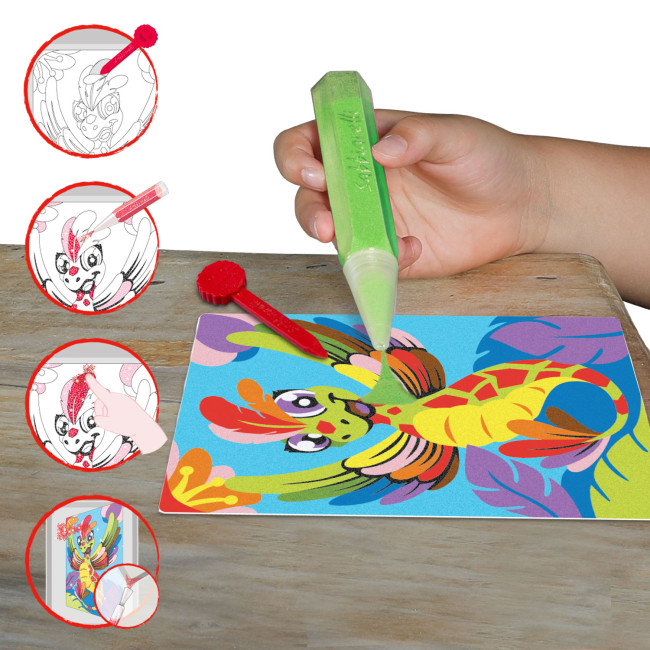 La stampa con laseratura viene fatta a diversi livelli di incisione per facilitare il distacco dei singoli elementi dai fogli adesivi e la rimozione della pellicola prima di colorare con la sabbia.