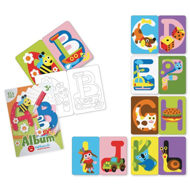 Ogni album contiene disegni pretagliati su carta adesiva raffiguranti lettere e numeri a forma di animali e oggetti, pronti per essere colorati con la sabbia.