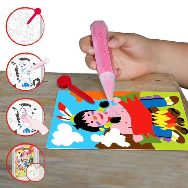 La stampa con laseratura viene fatta a diversi livelli di incisione per facilitare il distacco dei singoli elementi dai fogli adesivi e la rimozione della pellicola prima di colorare con la sabbia.