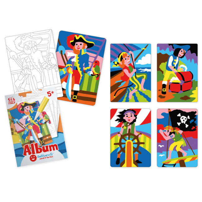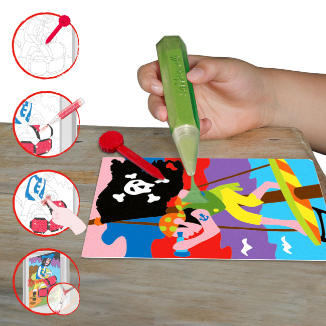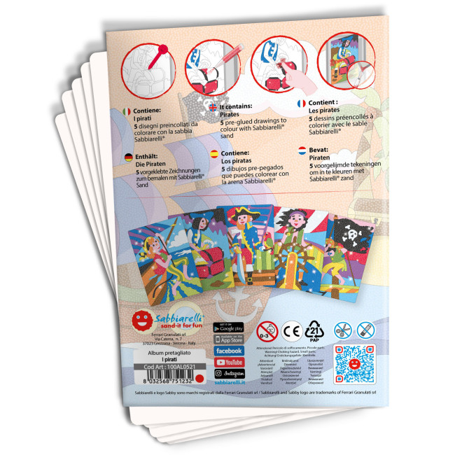 La stampa con laseratura viene fatta a diversi livelli di incisione per facilitare il distacco dei singoli elementi dai fogli adesivi e la rimozione della pellicola prima di colorare con la sabbia.