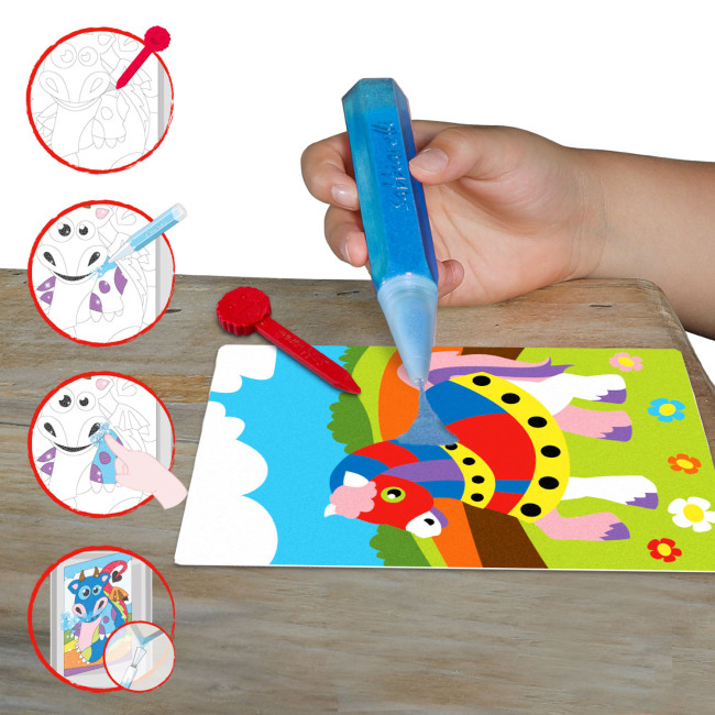 La stampa con laseratura viene fatta a diversi livelli di incisione per facilitare il distacco dei singoli elementi dai fogli adesivi e la rimozione della pellicola prima di colorare con la sabbia.