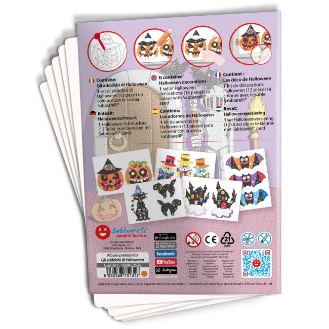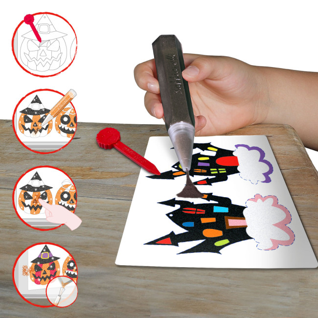 La stampa con laseratura viene fatta a diversi livelli di incisione per facilitare il distacco dei singoli elementi dai fogli adesivi e la rimozione della pellicola prima di colorare con la sabbia.