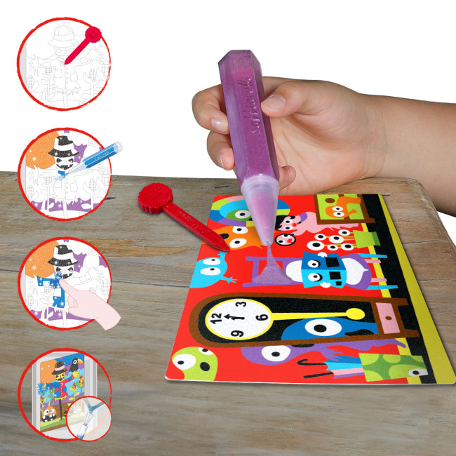 La stampa con laseratura viene fatta a diversi livelli di incisione per facilitare il distacco dei singoli elementi dai fogli adesivi e la rimozione della pellicola prima di colorare con la sabbia.