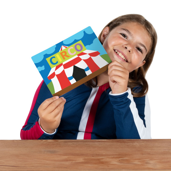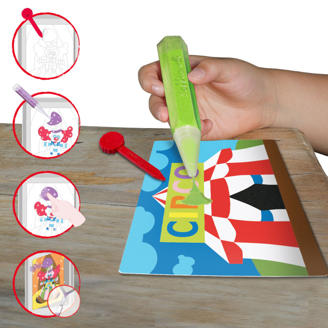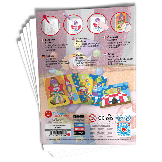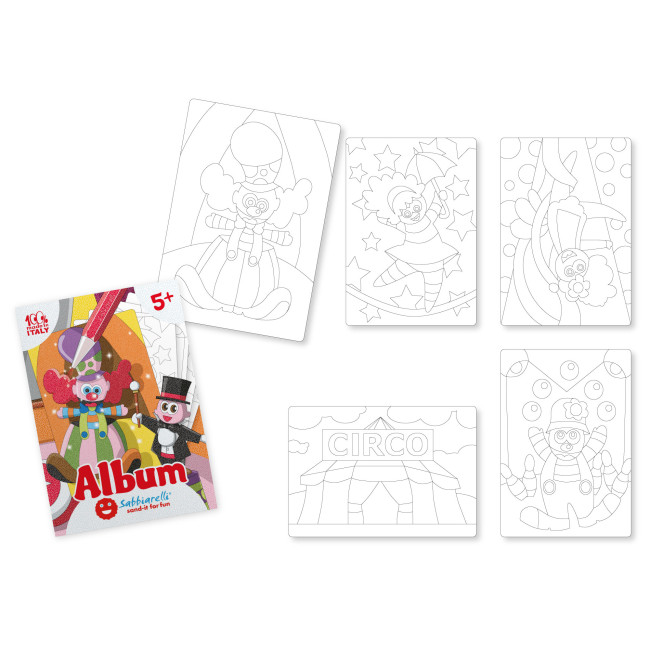 L'album contiene 5 disegni (15x20cm) pretagliati su carta adesiva raffiguranti la vita nel circo, pronti per essere colorate con la sabbia. Non servono né forbici, né colla: rimuovendo la carta dal disegno rimane la superficie adesiva da colorare con le sabbie Sabbiarelli® (sabbia non inclusa)