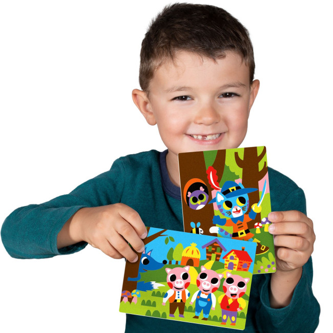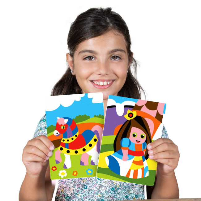 Ogni album contiene 5 disegni (15x20cm) pretagliati su carta adesiva raffiguranti diversi soggetti del mondo delle fiabe, pronti per essere colorati con la sabbia.