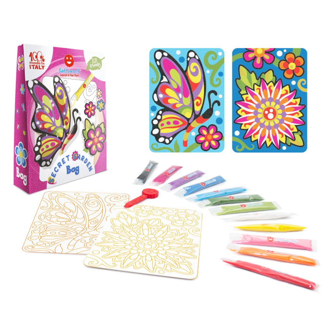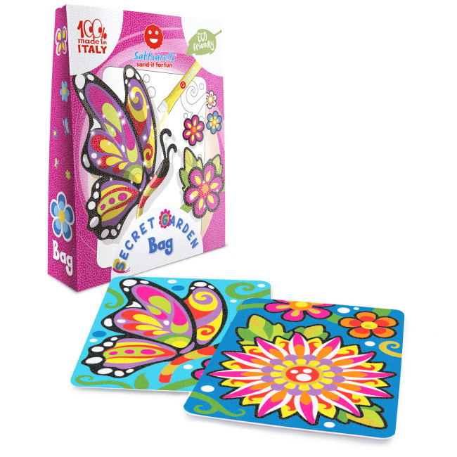 Sabbiarelli presenta le nuovissime Bag Sabbiarelli, i mini kit di sandpainting con 12 bustine di sabbia colorata e tanti soggetti diversi da colorare con la tecnica del sand painting. Ogni bag contiene 2 disegni adesivi, uno spellicolino e 12 bustine di sabbia scintillante.