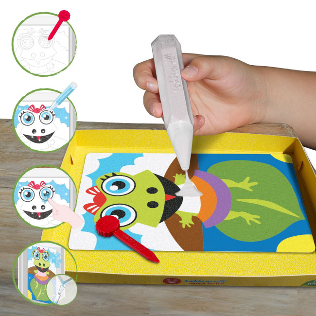 Grazie alle speciali penne Sabbiarelli, colorare con la sabbia è un'azione alla portata di tutti: i piccoli artisti possono liberare la loro creatività nella colorazione, seguendo l'esempio colore o scegliendo nuove combinazioni o ancora creando nuove sfumatore di colore mischiando tra loro le sabbie, senza sprechi.