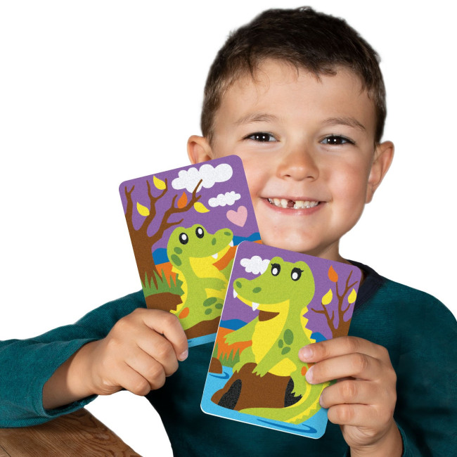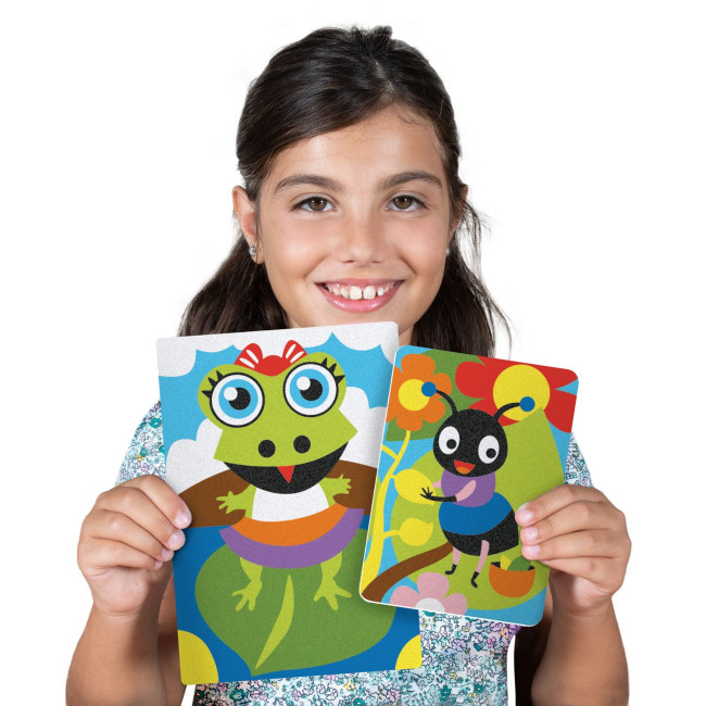 Ogni album contiene 5 disegni (15x20cm) pretagliati su carta adesiva raffiguranti diversi animali, pronti per essere colorati con la sabbia.