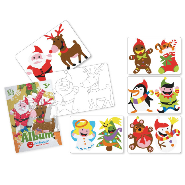 Ogni album contiene 5 fogli (15x20cm) pretagliati su carta adesiva contenenti disegni e addobbi natalizi da sabbiarellare.