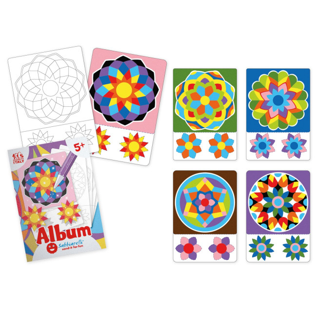 Ogni album contiene 5 disegni (15x20cm) pretagliati su carta adesiva, pronti per essere colorati con la sabbia.