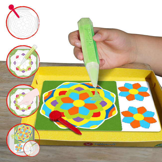 Grazie alle speciali penne Sabbiarelli, colorare con la sabbia è un'azione alla portata di tutti: i piccoli artisti possono liberare la loro creatività nella colorazione, seguendo l'esempio colore o scegliendo nuove combinazioni o ancora creando nuove sfumatore di colore mischiando tra loro le sabbie, senza sprechi.